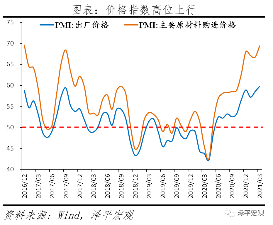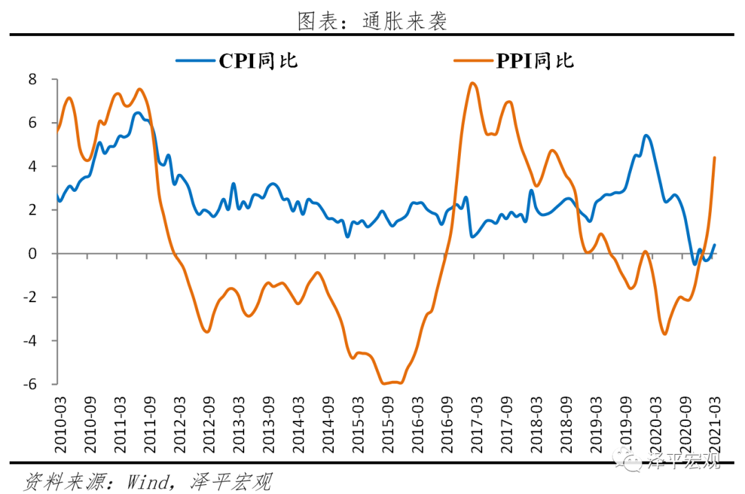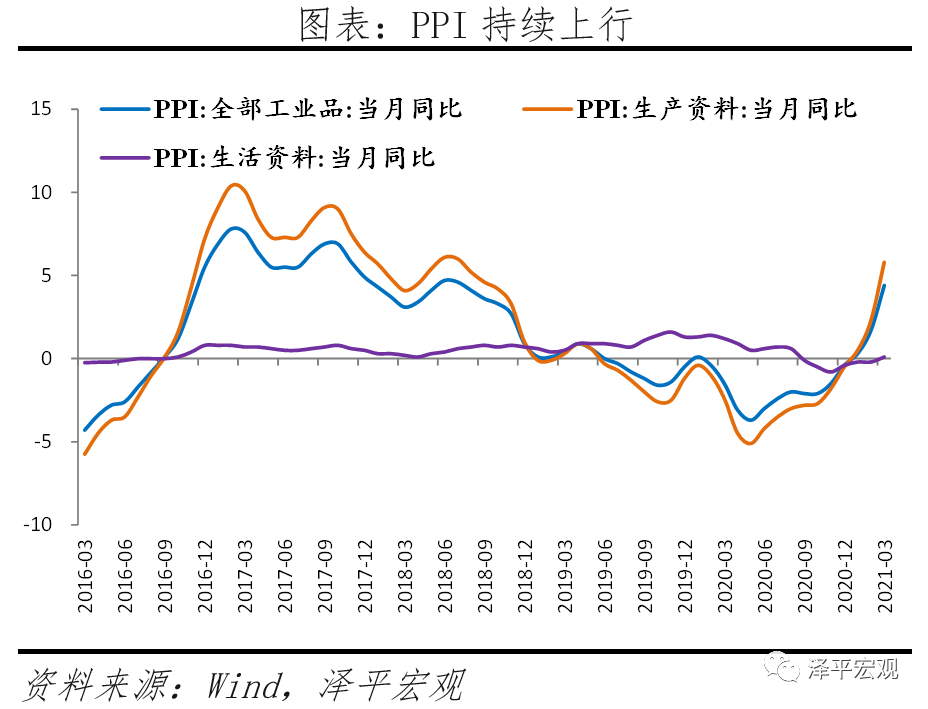 3月PPI同比涨4.4%,较上月上涨2.7个百分点;环比涨1.6%,创近年来新高。PPI上行主要受国际大宗商品价格拉动,与全球货币超发、供需缺口拉大有关。3月布伦特原油均价环比5.6%,南华工业品指数环比2.8%,南华螺纹钢环比7.6%,LME铜环比6.6%。分行业看,涨幅较大的主要是石油开采、石油等燃料加工、化工、有色和黑色金属,该五个行业合计影响PPI环比上涨约1.27个百分点,占总涨幅的八成。其中,石油和天然气开采业价格同比涨23.7%,环比涨9.8%;石油、煤炭及其他燃料加工业价格同比涨13.9%,环比涨5.7%;化学原料和化学制品制造业价格同比涨11.4%,环比涨5.3%;黑色金属冶炼及延压加工业同比涨21.5%,环比涨4.7%;有色金属冶炼及延压加工业同比涨21.3%,环比涨4.5%。