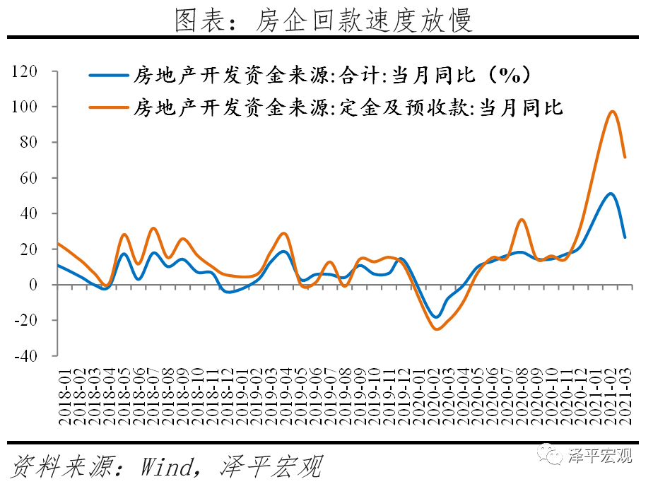 在中央及地方政府加强对经营贷管制、收紧房贷额度、加强购房资金来源排查、收紧限购限价、增收房产交易税、上海等地新房集中供应等调控房价和保障刚需措施下,市场购房热度较此前有所下降,抑制房企开发资金回笼。3月房地产开发资金来源同比增长26.6%,较1-2月下滑24.6个百分点,其中国内贷款、自筹资金、定金及预收款分别增长-6.8%、3.3%和71.5%,均较1-2月大幅下滑。
