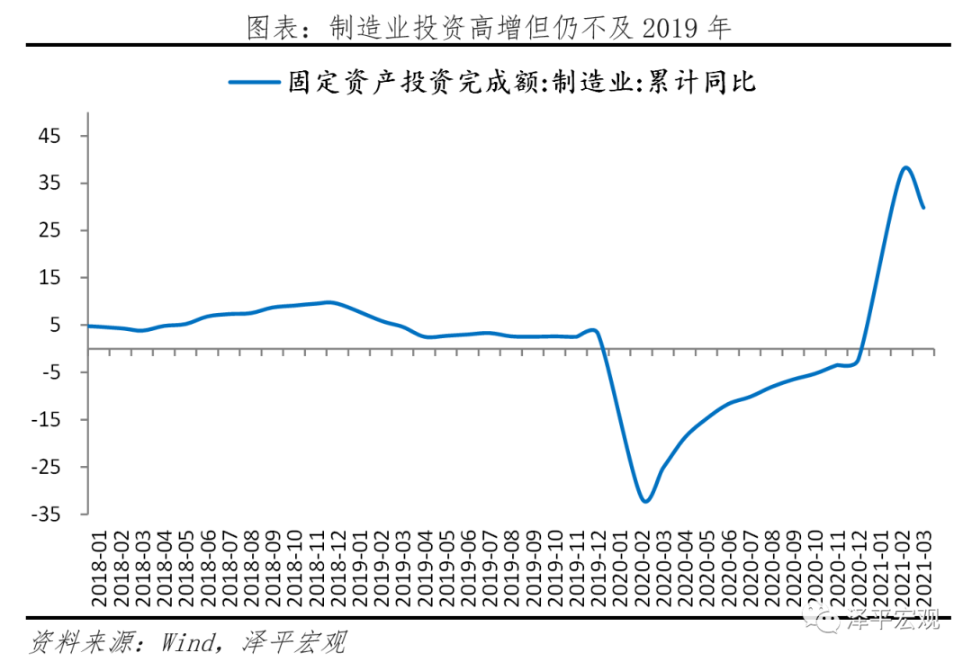 一季度制造业投资累计同比29.8%,两年平均增速-2.0%,降幅较1-2月收窄1.4个百分点。3月农副食品、化学原料、医药、铁路航空运输设备和电子设备投资同比分别增长36.0%、39.5%、29.4%、43.0%和39.5%。尽管当前制造业投资仍弱于2019年同期,但企业利润上升和出口增速高企将促使企业的预期和投资意愿向好。1-2月规模以上工业利润同比增长1.79倍,两年平均增长31.2%。