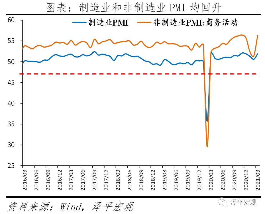 一季度工业增加值增速6.8%,较2020年四季度7.1%增速略有下滑,与一季度PMI生产端的变化趋势一致。