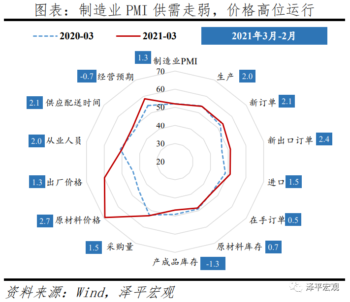 1)制造业供需季节性回暖,经济复苏进入顶部区间。生产指数和新订单指数分别为53.9%和53.6%,较上月上升2.0和2.1个百分点;1-3月均值分别为53.1%和52.5,较12月均下滑1.1个百分点。整体来看,一季度供需两端扩张力度出现减弱迹象,经济复苏进入顶部区间。供需差值有所缩小,生产端继续向需求端回归。新出口订单指数为51.2%,高于上月2.4百分点,重回荣枯线上,欧美制造业持续改善。经济动能(新订单-产成品库存)差值较上月上升3.4个百分点,高技术制造业和装备制造业等新动能行业发展较快,用工需求增加。