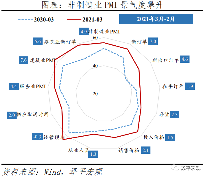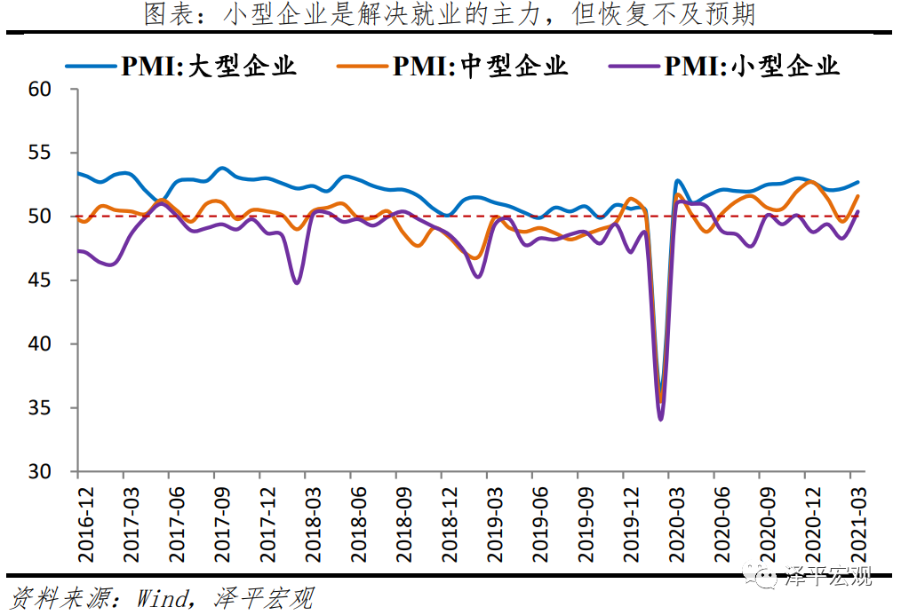 2)小型企业是解决就业的主力,但恢复不及预期。3月大、中、小型企业PMI分别为52.7%、51.6%和50.4%,较上月上升0.5、2.0和2.1个百分点,均位于荣枯线上。小型企业是解决就业的主力,但近几个月始终处于临界值上下波动,恢复基础不牢固,且与大中型企业差距较大。小型企业新订单、新出口订单指数和活动预期分别为50.9%、48.8%和58.4%,较上月大幅变动3.0、13.5和2.6个百分点;或与节后复产复工加快有关。但要警惕上游原材料涨价抬高小企业成本,对企业利润产生挤压。