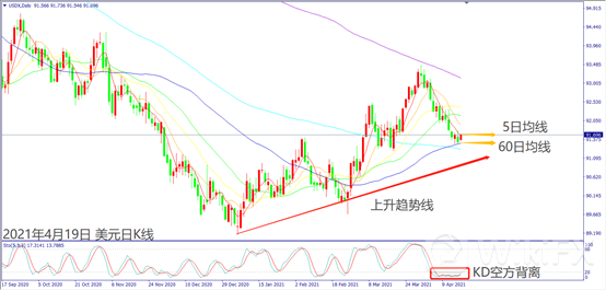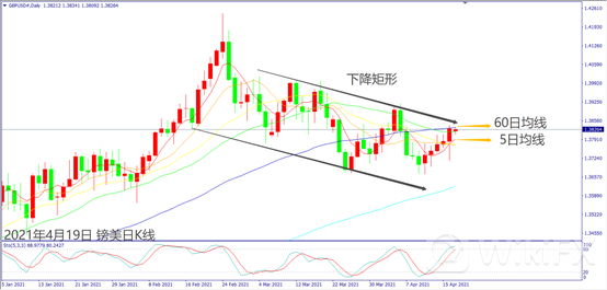 上周欧元区公布经济数据利好,以及美国施打强生疫苗出现血栓问题,美元跌破92关口最低价格来到91.48。也让欧美和镑美上周从低点分别上涨120和140个点。上周四(15日)清晨美联储经济褐皮书对美国复苏表示乐观,晚间美国公布零售销售数据好于市场预期,美元出现止跌反弹。上周五(16日)美国新冠疫情持续攀升,造成美元指数再创4月波段新低。英国和法国称将在5月维持宽松封锁措施,让欧美和镑美延续反弹涨势。