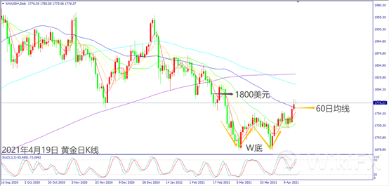 日级别线图,连续阳烛带动突破60日均线,若守住该均线,可能挑战1800美元。