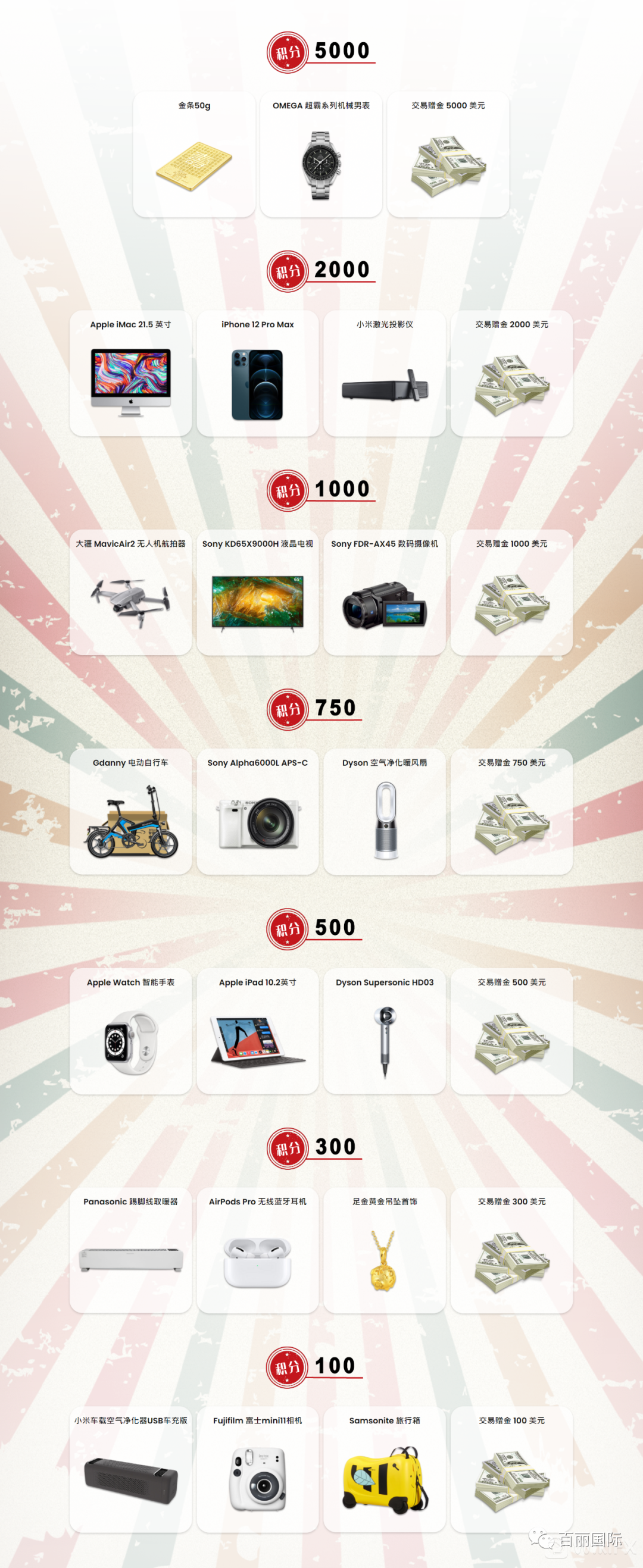 活动期间的新旧客户会自动参与积分奖赏计划。客户在交易指定产品并达到相应手数要求即可进行礼品兑换。换领时间由即日起至12月30日18:00截止,过期无效,兑换数量有限,先到先得,换领额满为止。