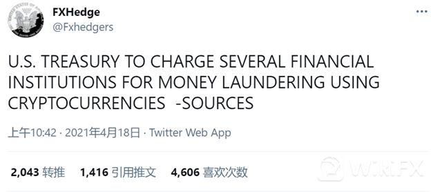 TMGM集团报道,有市场消息称美国财政部将指控数家金融机构使用加密货币洗钱。