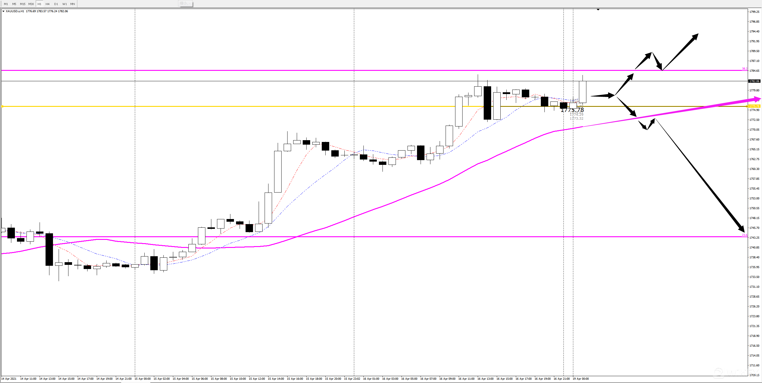 值得注意的是,目前黄金的黄金分割线我们是在日线级别连接自2021年11月6日至3月8日这波下跌的起点至终点得出。