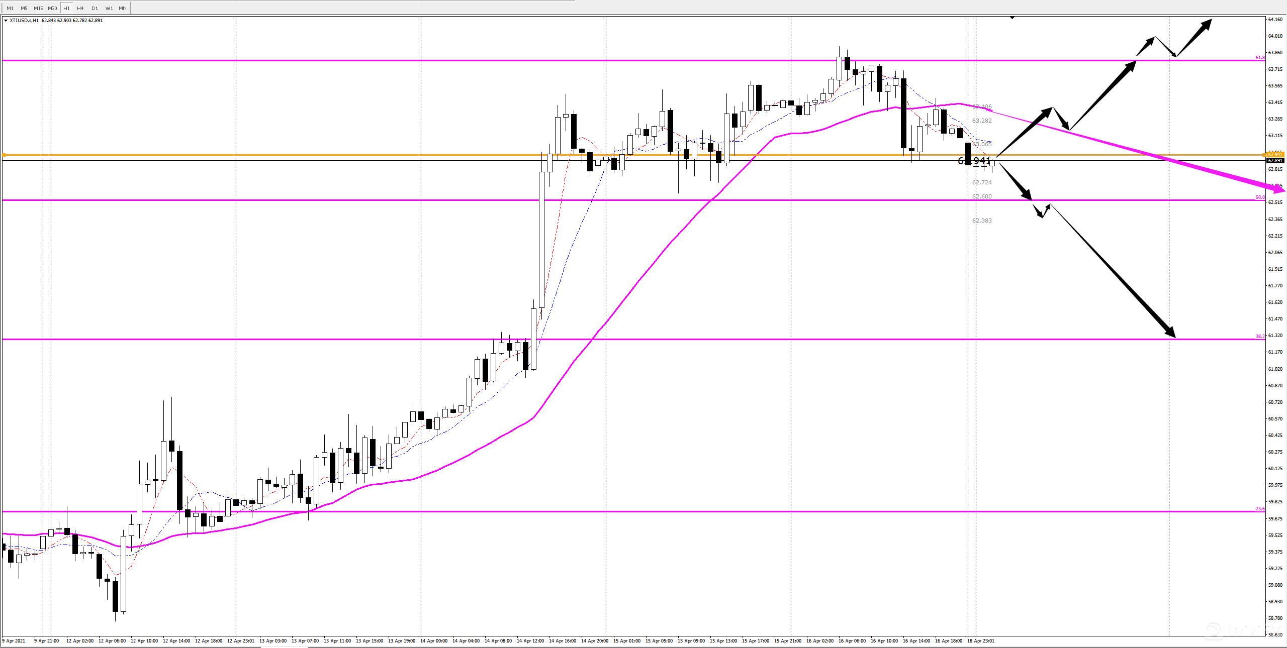 值得注意的是,目前原油的黄金分割我们是在日线级别连接自2021年3月8日至3月23日这波下跌的起点至终点得出。