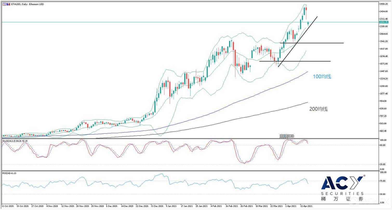 从以太坊日线图来看,周末的大幅下跌并没有扭转整体的上涨趋势,100和200日均线保持上行,呈现强多头局势。这波下跌还未跌破趋势线,在2200附近受到了支撑。考虑到Coinbase上市后的推动力,同时监管政策不会这么快出炉,加密市场中短期内仍会受到一定的支撑,所以短线交易还是以多单为主。不过从技术指标来看,随机指标刚形成超买区死叉,开口逐渐扩大。同时RSI背离形态明显,收出锐角反转并回到了中心区域。整体来看,加密市场可能需要时间在现价位置进行换手整理,以太坊短线仍有下跌的空间,趋势线与布林带中线的支撑力可能并不强。由于加密货币波动性较大,现价下方的支撑可以看布林带下沿,1600和1900两个位置分别是前两个低点的需求区,可以作为短线多单入场的点位参考。