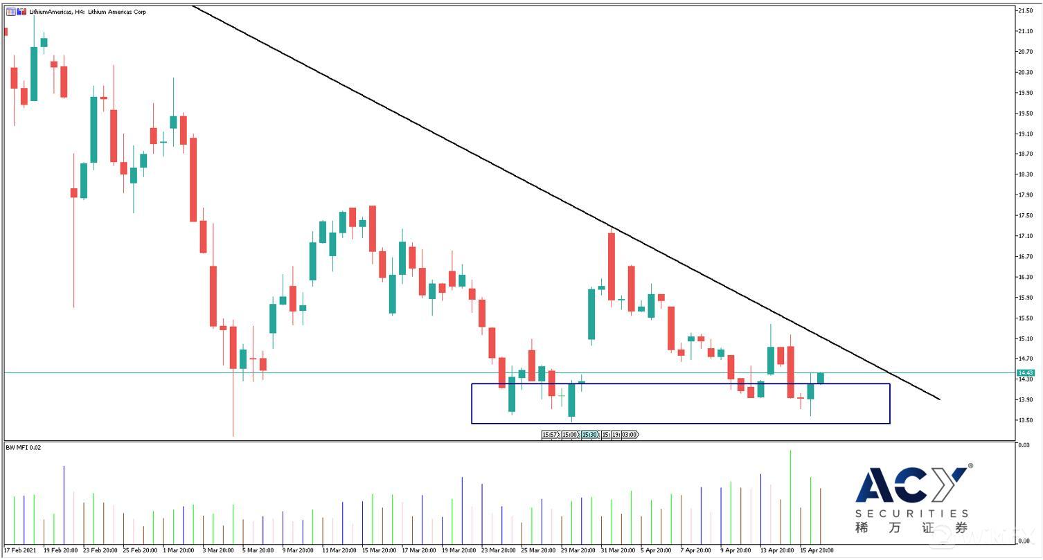 从Lithium Americas四小时图来看,股价从今年年初开始大幅下跌,直接从28砍半到14,并在14附近来回震荡。下降趋势线持续压制股价,整体保持下行动力。指标方面,市场促进指标连续收出绿色与棕色柱线,同样表现出下行局势。不过从公司表现来看,股价与基本面形成了明显的背离,现价下方可能会有较强的买方支撑,出现了长线布局的机会。最近股价震荡收敛,准备测试趋势线压制。 14附近的价格静区将会提供一定的支撑力量,考虑到仍有下行的可能,该位置做多可以采用测试类多单入场,以控制风险。再下方的长线支撑主要集中在12上方附近的价格整理区域以及10的整数位大关。