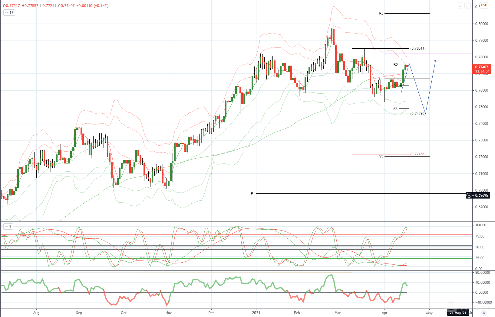 AUDUSD 日内偏差 : 看跌下方.7700看涨上方