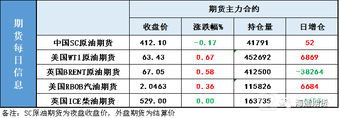【1】WTI主力原油期货收涨0.42美元,涨幅0.67%,报63.43美元/桶;布伦特主力原油期货收涨0.39美元,涨幅0.58%,报67.05美元/桶;INE原油期货收跌0.17%,报412.1元。