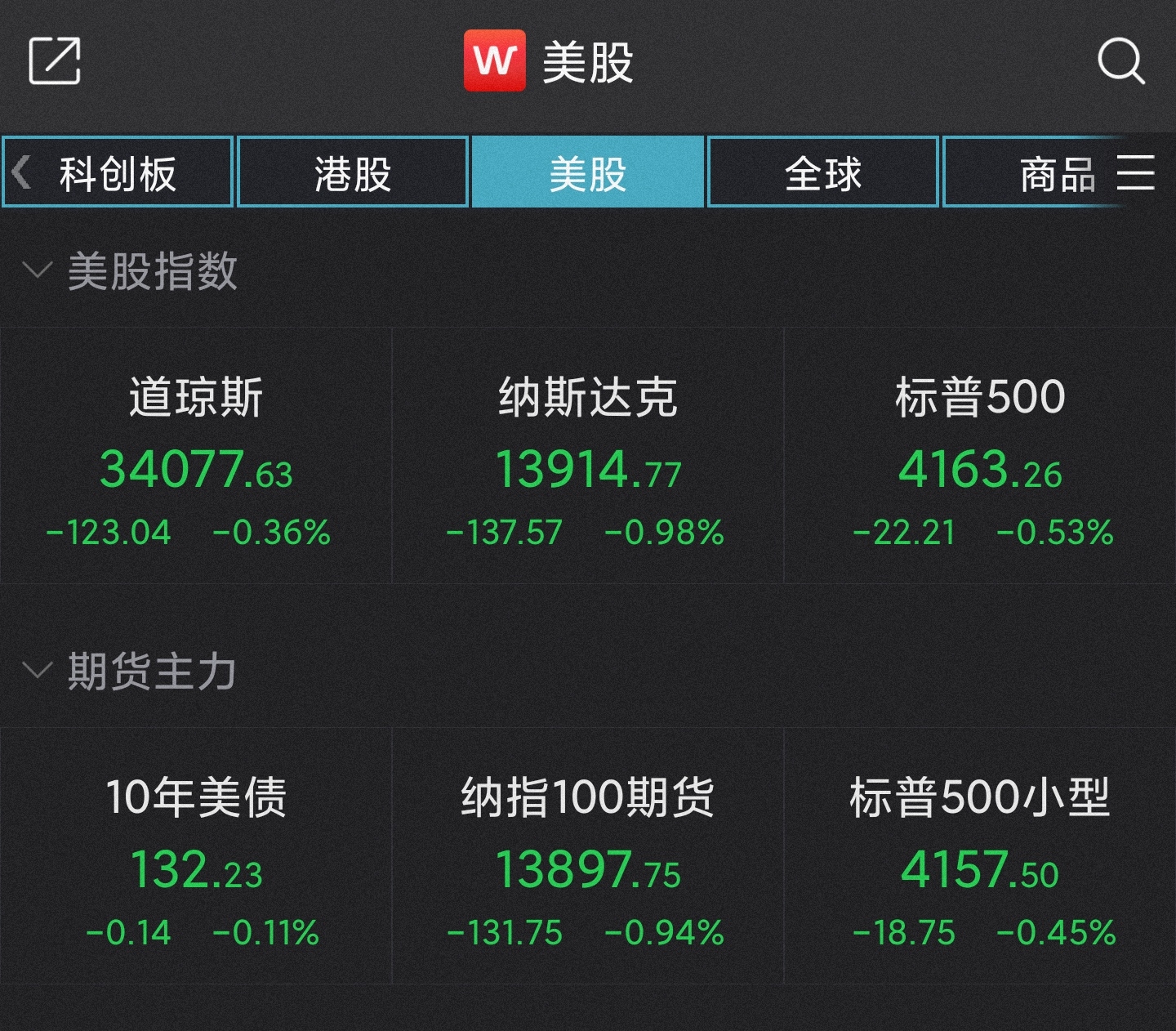 具体来看,道指跌123.04点,跌幅0.36%,报34077.63点;纳指跌137.57点,跌幅0.98%,报13914.77点;标普500指数跌22.21点,跌幅0.53%,报4163.26点。