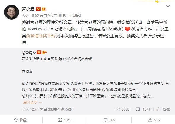 19日,如是金融研究院院长、首席经济学家管清友微博发文声援罗永浩:被逼签“对赌协议”不合情不合理。