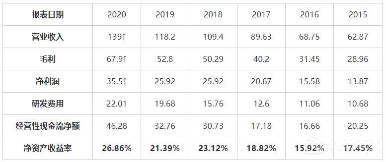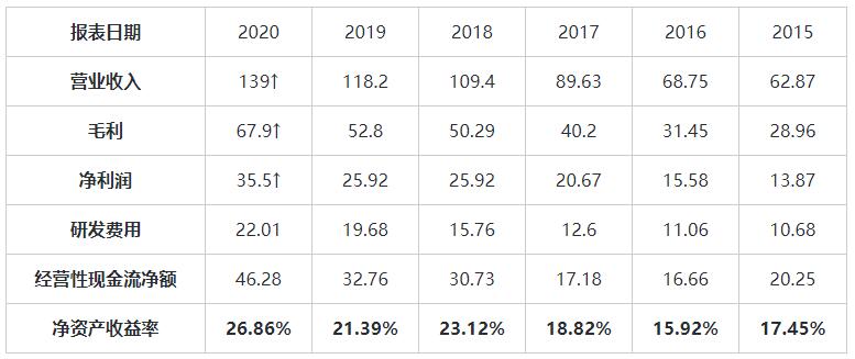 财务数据方面,2015年到2020年,其营业收入从62.87上升至139亿欧元;净利润从13.87上升至35.5亿欧元,年均增长基本上都保持在两位数以上,实属罕见。而2020年继续保持快速增长,总共实现净销售额139.8亿欧元,较去年同期118.2亿欧元提高近18.26%;净利润35.5亿欧元同样大幅提升37.09%。此外,在保持高强度研发的同时,还有较高的经营性现金流净额是相当不错的。