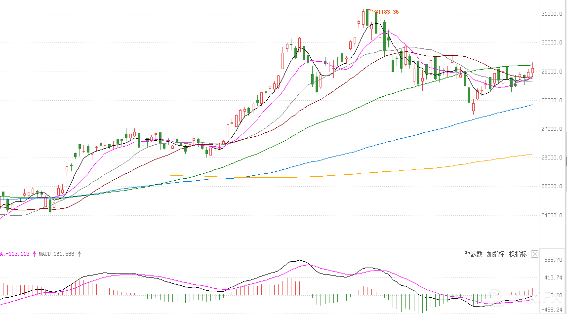 港股市场:周一,港股早盘大幅走高,恒生指数午后涨幅收窄、于29000点上方窄幅震荡。收盘,恒指收涨0.47%。盘面上,新能源汽车相关整车及供应链板块集体大涨;苹果概念、生物医药等多个板块全日强势。