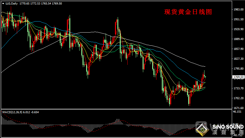 现货黄金日线图看,昨日金价呈现长上影线阴线回落,终止二日连涨态势,金价高位回落至5日均线上方,目前5日均线对金价短线支撑仍然有效。同时,金价5日和10日均线与50日均线都已经形成金叉,估计金价回调整理后,仍然有望再度上攻1790附近。从指标看,日线MACD指标正动能柱持续增加,RSI指标在58位置附近走平。