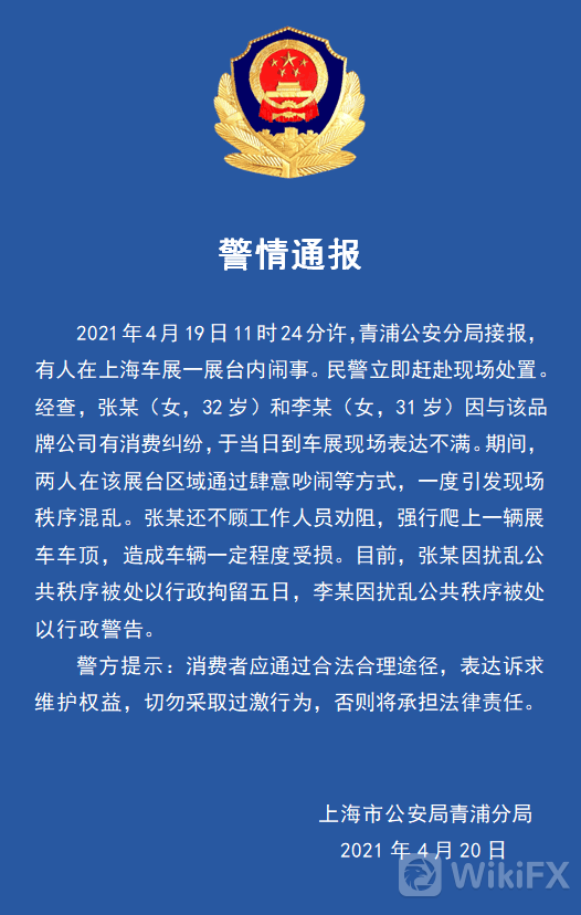 而据@警民直通车-上海 微博刚刚消息,2021年4月19日11时24分许,青浦公安分局接报,有人在上海车展一展台内闹事。民警立即赶赴现场处置。经查,张某(女,32岁)和李某(女,31岁)因与该品牌公司有消费纠纷,于当日到车展现场表达不满。期间,两人在该展台区域通过肆意吵闹等方式,一度引发现场秩序混乱。张某还不顾工作人员劝阻,强行爬上一辆展车车顶,造成车辆一定程度受损。目前,张某因扰乱公共秩序被处以行政拘留五日,李某因扰乱公共秩序被处以行政警告。