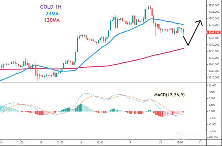 黄金(GOLD)一小时图 –24MA、120MA及MACD指标