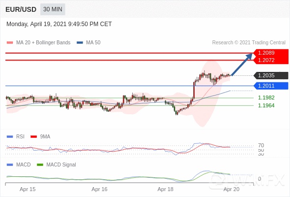 欧元/美元 当日内: 看涨,当 1.2011 为支撑位,目标定在1.2089。转折点定在:1.2011 交易策略:看涨,当 1.2011 为支撑位,目标定在1.2089。 备选策略:向下跌破 1.2011 ,将带来继续下跌的趋势,目标位为 1.1982 然后为 1.1964 。 技术点评 :RSI技术指标超过50。 MACD技术指标处在其信号线之下 看多。 此外,价位高于其20天及50天移动平均线 ( 分别位于 1.2033 和 1.1999 )。