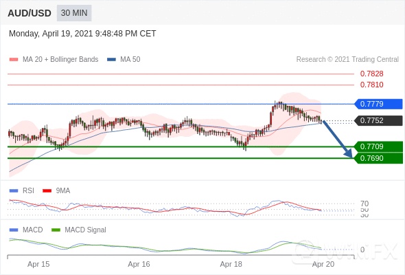 澳元/美元 当日内: 逐渐下跌,当 0.7779 阻碍上行,则 0.7690 为目标位。 0.7779 作为转折点。交易策略:逐渐下跌,当0.7779 阻碍上行,则 0.7690 为目标位。 备选策略:如突破 0.7779 ,AUD/USD 目标方向为 0.7810 和 0.7828 。 技术点评 :RSI技术指标低于50。 MACD技术指标处在其信号线之下 看多。 另外,价位在其20天移动平均线以下 ( 0.7764 ) 但高于其50天移动平均线 ( 0.7747 )。