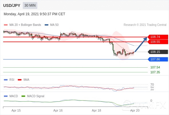 美元/日元 当日内: 有上涨的可能,目标价位定在 108.74 。 107.86 作为转折点。交易策略:有上涨的可能,目标价位定在108.74 。 备选策略:向下跌破 107.86 ,将带来继续下跌的趋势,目标位为 107.54 然后为 107.35 。 技术点评 :RSI技术指标低于50。 MACD技术指标处在其信号线之上 看空。 另外,价位低于其50天移动平均线 ( 108.40 ) 但高于其20天移动平均线 ( 108.12 )。