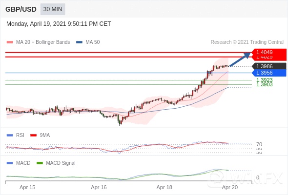 英镑/美元 当日内: 看涨,当 1.3956 为支撑位,目标定在1.4049。转折点为:1.3956 交易策略:看涨,当 1.3956 为支撑位,目标定在1.4049。 备选策略:如跌破 1.3956 ,GBP/USD 目标方向定在 1.3923 和 1.3903 。 技术点评 :RSI技术指标大于70。在这种情况下,说明有很强的上升趋势,或者意味着处在超买的状态下,可能会有向下的调整。我们将观察RSI技术指标是否出现背离现象。 MACD技术指标处在其信号线之下 看多。 此外,价位高于其20天及50天移动平均线 ( 分别位于 1.3964 和 1.3891 )。
