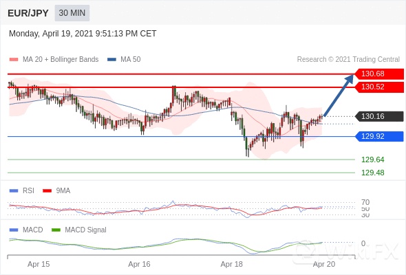 欧元/日元 当日内: 看涨,当 129.92 为支撑位。转折点为:129.92 交易策略:看涨,当 129.92 为支撑位。 备选策略:向下跌破 129.92 ,将带来继续下跌的趋势,目标位为 129.64 然后为 129.48 。 技术点评 :RSI技术指标大于中性区域50。 MACD技术指标处在其信号线之上 看多。 此外,价位高于其20天及50天移动平均线 ( 分别位于 130.11 和 130.07 )。