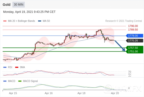 Gold 当日内: 看跌,在 1779.00 之下。 转折点为:1779.00 交易策略:看跌,在 1779.00 之下。 备选策略:向上突破 1779 ,将带来继续上行的趋势,目标位定在 1789.50 和 1796 。 技术点评 :RSI技术指标低于50。 MACD技术指标呈现看跌状态并 处在其信号线的下方。 此外,价位处在其20个时期及50个时期移动平均线下方 ( 当前是 1775.31 和 1777.73 )。