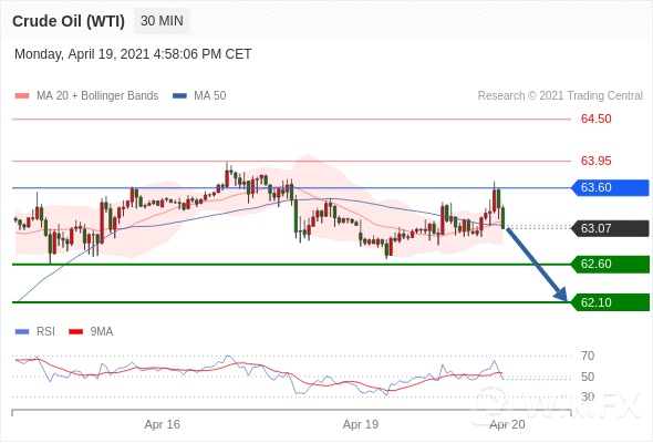 原油(WTI)(M1)当日内: 短期关键阻力位在63.60。转折点:63.60 交易策略:在 63.60 之下,看跌,目标价位为 62.60 ,然后为 62.10 。 备选策略:在 63.60 上,看涨,目标价位定在 63.95 ,然后为 64.50。 技术点评:只要依旧存在63.60阻力位,价格波动存在看跌的趋势。