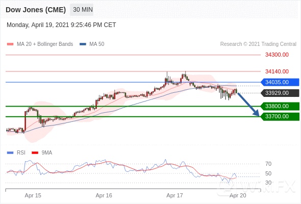 美国道琼斯30指数 (M1)当日内: 反转向下。转折点:34035.00 交易策略:在 34035.00 之下,看跌,目标价位为 33800.00 ,然后为 33700.00 。 备选策略:在 34035.00 上,看涨,目标价位定在 34140.00 ,然后为 34300.00。 技术点评:RSI技术指标呈现进一步向下趋势。