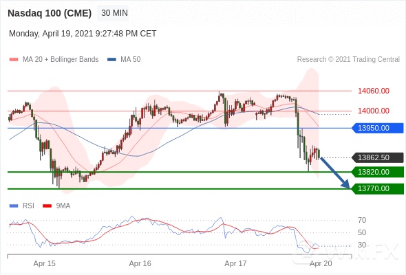 美国纳斯达克100指数期货 (M1)当日内: 存在压力。转折点:13950.00 交易策略:在 13950.00 之下,看跌,目标价位为 13820.00 ,然后为 13770.00 。 备选策略:在 13950.00 上,看涨,目标价位定在 14000.00 ,然后为 14060.00。 技术点评:RSI技术指标看跌,有进一步下降空间。