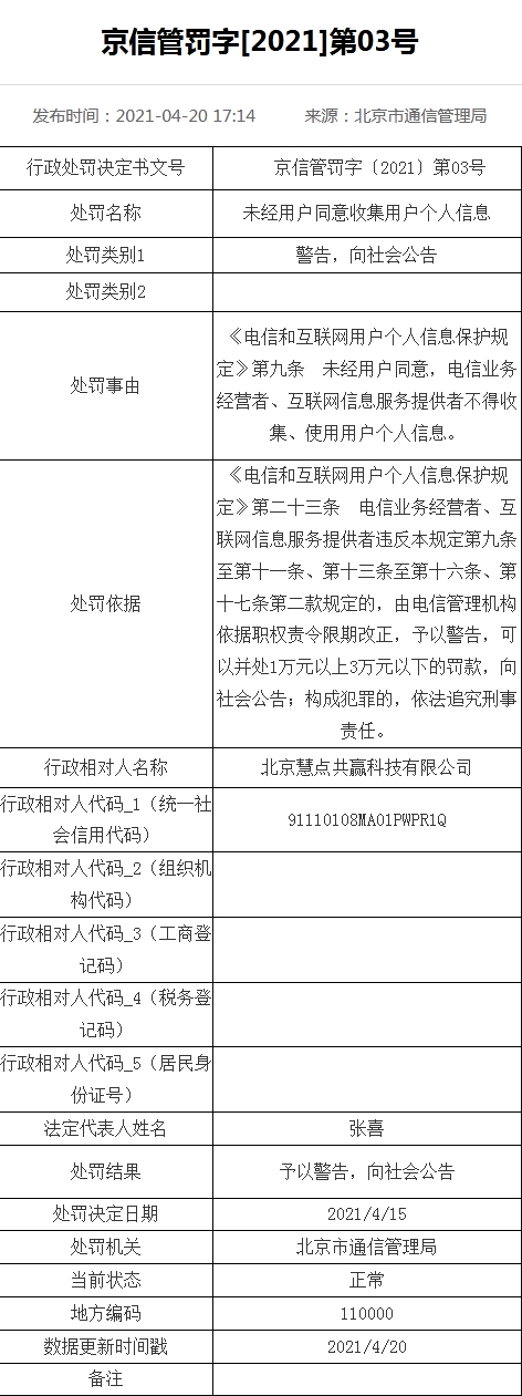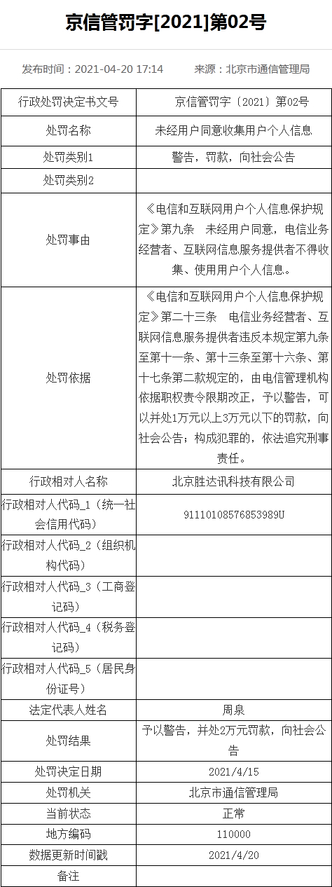 北京市通信管理局对北京胜达讯科技有限公司予以警告,并处2万元罚款,向社会公告;对北京慧点共赢科技有限公司警告,向社会公告。处罚决定日期2021年4月15日。