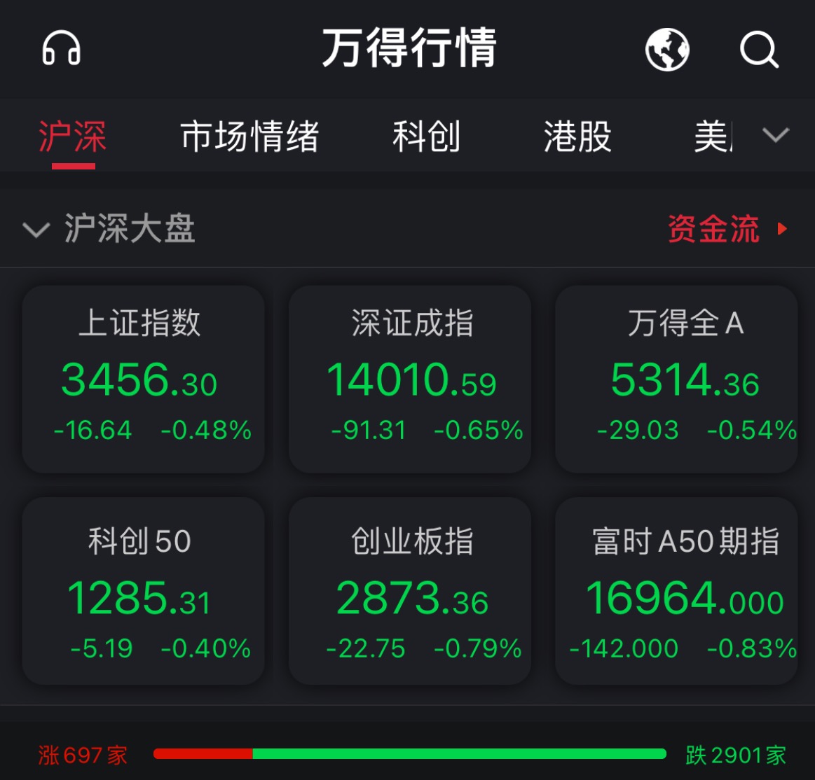 沪指低开3456.30点,跌幅0.48%,成交额42.54亿元;深成指报14010.59点,跌幅0.65%,成交额44.31亿元;创业板指报2873.36点,跌幅0.79%;上证50指数3493.79点,跌幅0.47%;沪深300报5055.24点,跌幅0.55%。