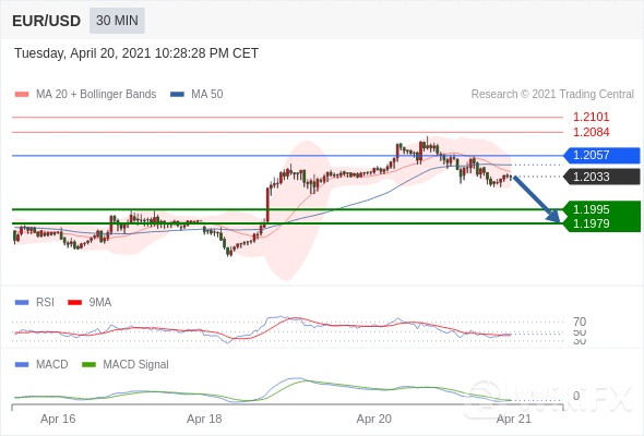 欧元/美元 当日内: 看跌,在 1.2057 之下。 1.2057 作为转折点。 交易策略:看跌,在 1.2057 之下。备选策略:如突破1.2057 ,EUR/USD 目标方向为 1.2084 和 1.2101 。 技术点评 :RSI技术指标低于50。 MACD技术指标处在其信号线之下 看空。 此外,价位处在其20天及50天移动平均线下方 ( 当前是 1.2039 和 1.2046 )。