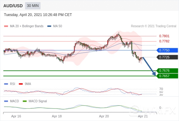 澳元/美元 当日内: 看跌,在 0.7750 之下。 0.7750 作为转折点。 交易策略:看跌,在 0.7750 之下。备选策略:如突破0.7750 ,AUD/USD 目标方向为 0.7782 和 0.7801 。 技术点评 :RSI技术指标小于中性区域50。 MACD技术指标呈现看跌状态并 处在其信号线的下方。 此外,价位处在其20天及50天移动平均线下方 ( 当前是 0.7747 和 0.7768 )。