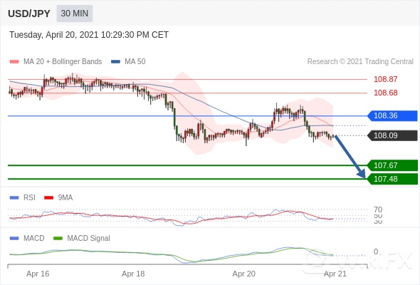 美元/日元 当日内: 看跌,在 108.36 之下。 108.36 作为转折点。 交易策略:看跌,在 108.36 之下。备选策略:向上突破108.36 ,将带来继续上行的趋势,目标位定在 108.68 和 108.87 。 技术点评 :RSI技术指标低于50。 MACD技术指标处在其信号线之下 看空。 此外,价位低于其20天及50天移动平均线 ( 分别位于 108.21 和 108.23 )。