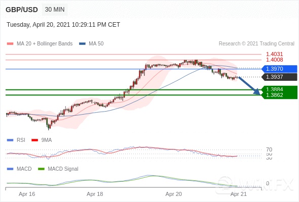 英镑/美元 当日内: 看跌,在 1.3970 之下。 转折点定在:1.3970 交易策略:看跌,在 1.3970 之下。备选策略:向上突破1.3970 ,将带来继续上行的趋势,目标位定在 1.4008 和 1.4031 。 技术点评 :RSI技术指标小于中性区域50。 MACD技术指标呈现看跌状态并 处在其信号线的下方。 此外,价位处在其20天及50天移动平均线下方 ( 当前是 1.3950 和 1.3975 )。