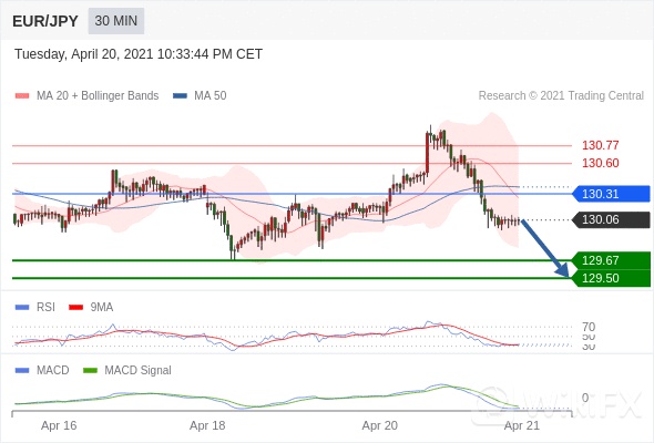 欧元/日元 当日内: 看跌,在 130.31 之下。 130.31 作为转折点。 交易策略:看跌,在 130.31 之下。 备选策略:如突破130.31 ,EUR/JPY 目标方向为 130.60 和 130.77 。 技术点评 :RSI技术指标小于中性区域50。 MACD技术指标处在其信号线之下 看空。 此外,价位低于其20天及50天移动平均线 ( 分别位于 130.27 和 130.38 )。