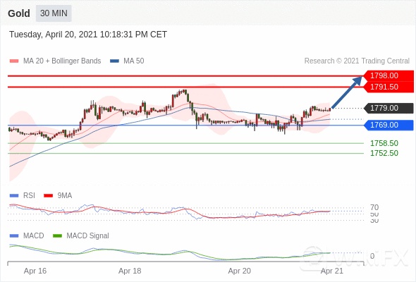 Gold 当日内: 看涨,当 1769.00 为支撑位。 转折点为:1769.00 交易策略:看涨,当 1769.00 为支撑位。 备选策略:如跌破 1769 ,Gold 目标方向定在 1758.50 和 1752.50 。 技术点评 :RSI技术指标大于中性区域50。 MACD技术指标处在其信号线之上 看多。 此外,价位高于其20个时期及50个时期移动平均线 ( 分别位于 1775.57 和 1772.60 )。