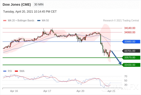 美国道琼斯30指数 (M1)当日内: 下跌趋势。转折点:33880.00 交易策略:在 33880.00 之下,看跌,目标价位为 33570.00 ,然后为 33430.00 。 备选策略:在 33880.00 上,看涨,目标价位定在 34060.00 ,然后为 34140.00。 技术点评:RSI技术指标运行趋势复杂,倾向于下降。