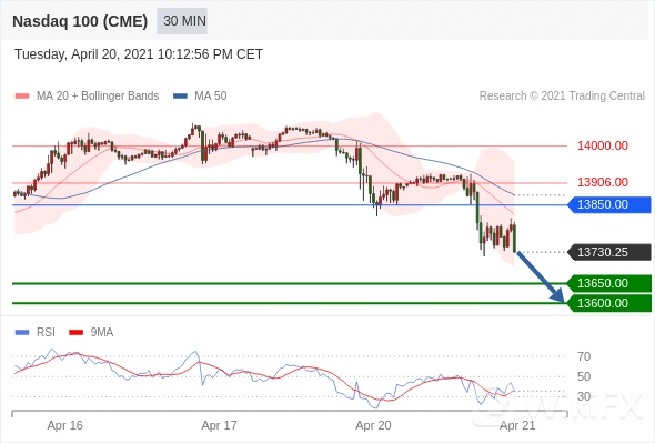 美国纳斯达克100指数期货 (M1)当日内: 存在压力。转折点:13850.00 交易策略:在 13850.00 之下,看跌,目标价位为 13650.00 ,然后为 13600.00 。 备选策略:在 13850.00 上,看涨,目标价位定在 13906.00 ,然后为 14000.00。 技术点评:RSI技术指标看跌,有进一步下降空间。