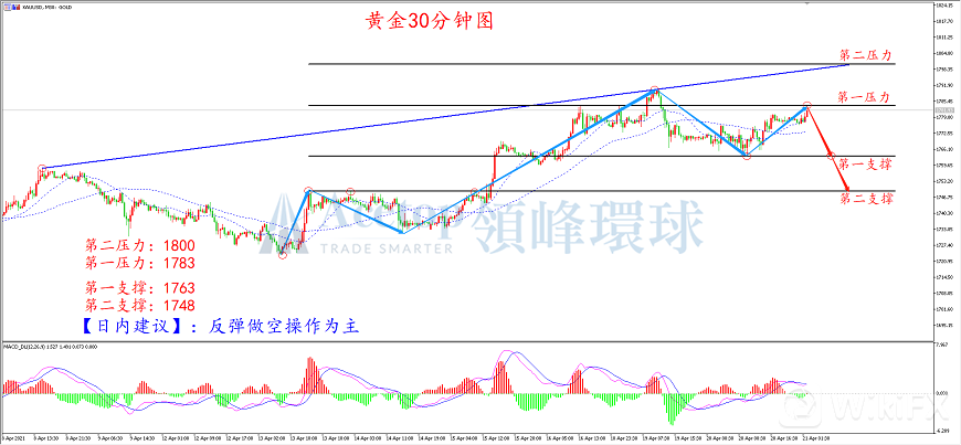黄金自1790附近承压下行,昨日在1763附近获得支撑并展开反弹,上方1783的前期高点压力或成为今日反弹第一压力位,而1800的前期高点连线位置或成为第二压力位,下方1763的昨日低点位置可成为今日金价下行的第一支撑位,下破后有望进一步看向前期上涨平台突破位,1748或是第二支撑位,考虑到黄金月线级别MA5、MA10均线死叉向下,且金价处于压力位附近,短期金价下行压力大,从30分钟周期图看,MACD指标DIFF线与DEA线死叉向下,表明走势偏空,后市回落的概率增大,操作上可重点关注空单机会。