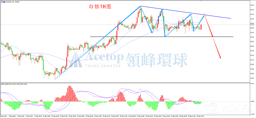 从1H周期图看,白银价格自26.28高点回落以来,高低点逐步降低,呈现下降结构,MA20、MA60均线死叉向下压制价格反弹,而上方26.00的下降趋势线压制力道较强;在上破26.00之前,白银高空为主,下方关注25.60支撑位,下破后有望进一步看向25.00整数支撑,结合MACD指标来看,DIFF线与DEA线处于零轴下方死叉,表明走势偏空,后市进一步下行的概率增大,因此投资者日内可关注空单机会。