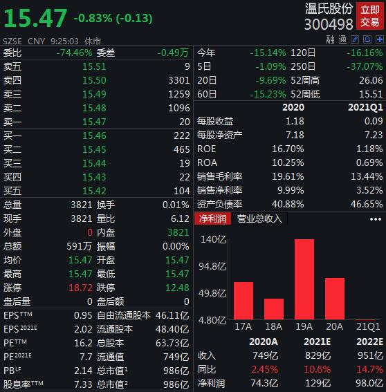22日,温氏股份(300498,股吧)低开0.83%。21日晚,温氏股份发布一季报,公司实现营收168.16亿元,同比下降3.60%;归属于上市公司股东的净利润5.44亿元,同比下降71.28%。
