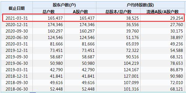截至3月31日,温氏股份股东总户数165437户,较2020年末减少近万户,户均持股38525股。