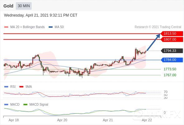 RSI技术指标超过50。MACD技术指标处在其信号线之上 看多。此外,价位高于其20个时期及50个时期移动平均线 ( 分别位于 1788.80 和 1783.82 )。
