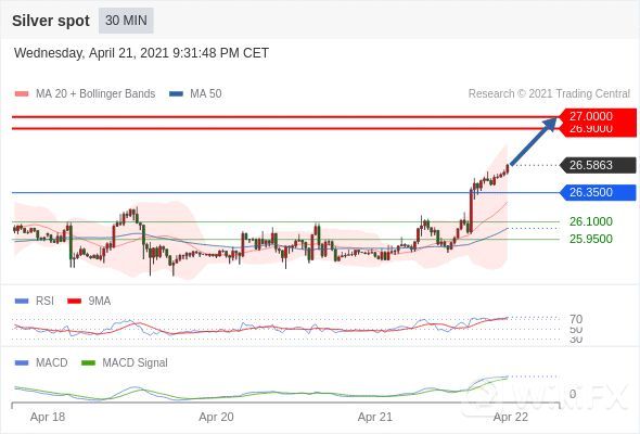 如跌破 26.3500 ,Silver 目标方向定在 26.1000 和 25.9500 。