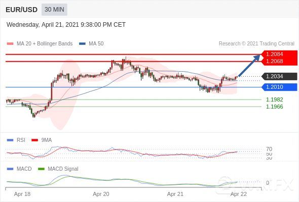 RSI技术指标超过50。MACD技术指标处在其信号线之上 看多。此外,价位高于其20天及50天移动平均线 ( 分别位于 1.2020 和 1.2025 )。