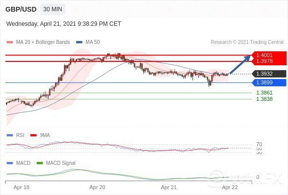 RSI技术指标超过50。MACD技术指标处在其信号线之上 看多。此外,价位处在其20天及50天移动平均线上方 ( 当前是 1.3925 和 1.3930 )。